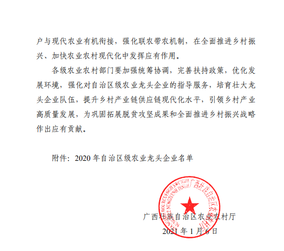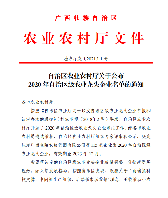 2021年1月6日 ,廣西壯族自治區(qū)農(nóng)業(yè)農(nóng)村廳公布了最新的2020 年自治區(qū)級(jí)農(nóng)業(yè)龍頭企業(yè)名單,其中包括 14個(gè)市的115家企業(yè)。本次遴選由各市農(nóng)業(yè)農(nóng)村局、自治區(qū)農(nóng)業(yè)農(nóng)村廳組織專家評(píng)審和公示,并最終決定。因廣西強(qiáng)壽藥業(yè)集團(tuán)強(qiáng)化“龍頭企業(yè)+企業(yè)+基地+農(nóng)戶”的模式帶動(dòng)周邊農(nóng)戶從事中草藥種植,扶助農(nóng)民走上致富之路成績顯著。本次榮獲“自治區(qū)級(jí)農(nóng)業(yè)龍頭企業(yè)”殊榮。