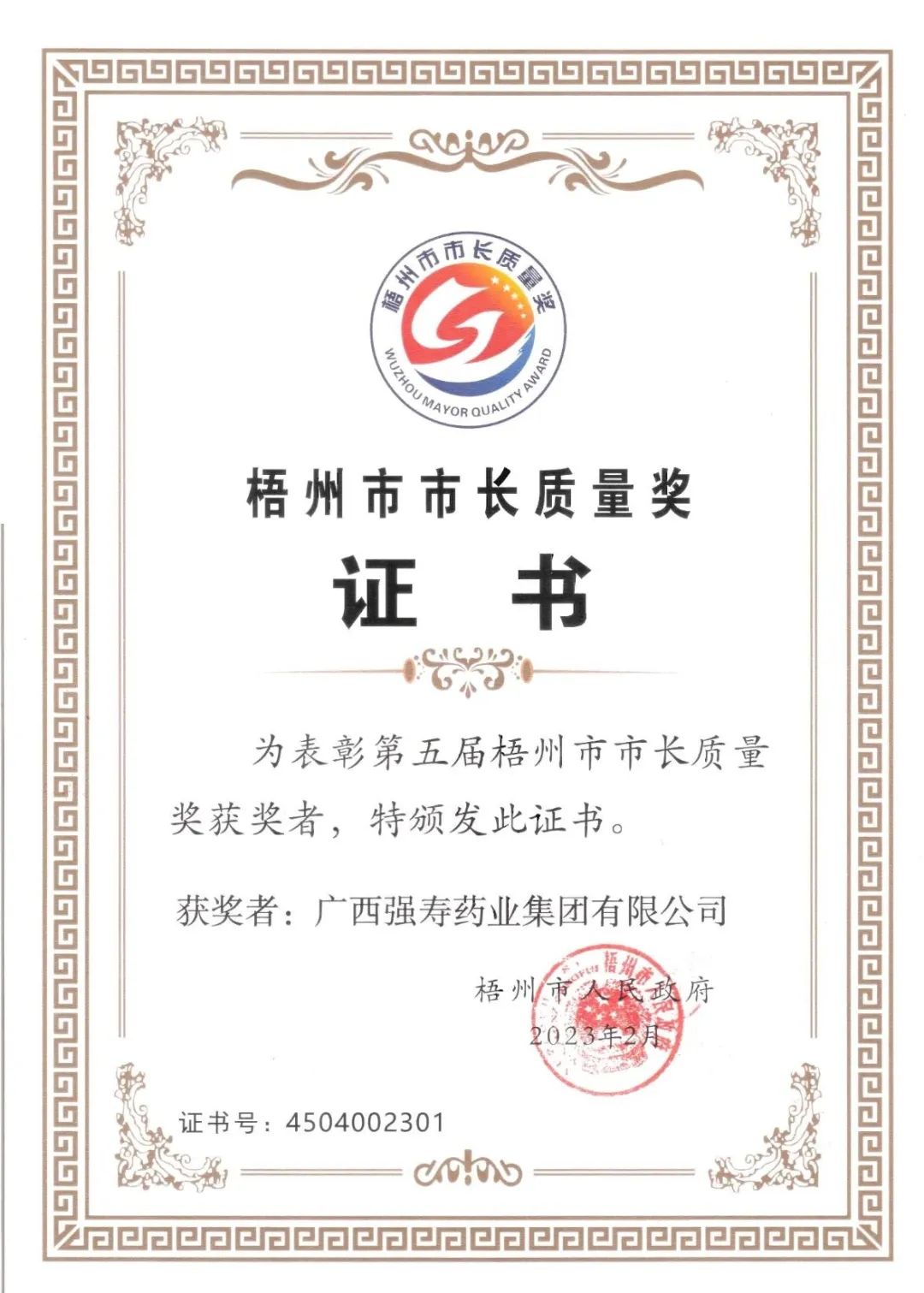 【喜訊】熱烈祝賀強壽集團榮獲第五屆梧州市市長質量獎